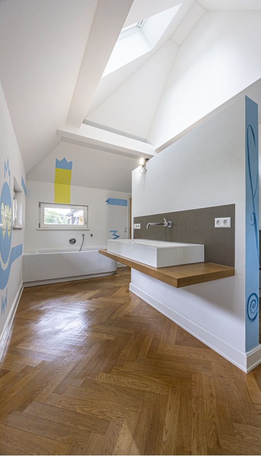 Ferner verfügt die Wohnung über ein Schlaf- oder Gästezimmer, ein Ankleidezimmer oder Büro, ein weiteres Schlaf- oder Kinderzimmer sowie das helle, großzügig verglaste Badezimmer, u.a. mit elektrisch steuerbarem Oberlicht, mit Walkin-Dusche, Badewanne, Doppelwaschbecken, WC, Bidet und Handtuchheizung.
