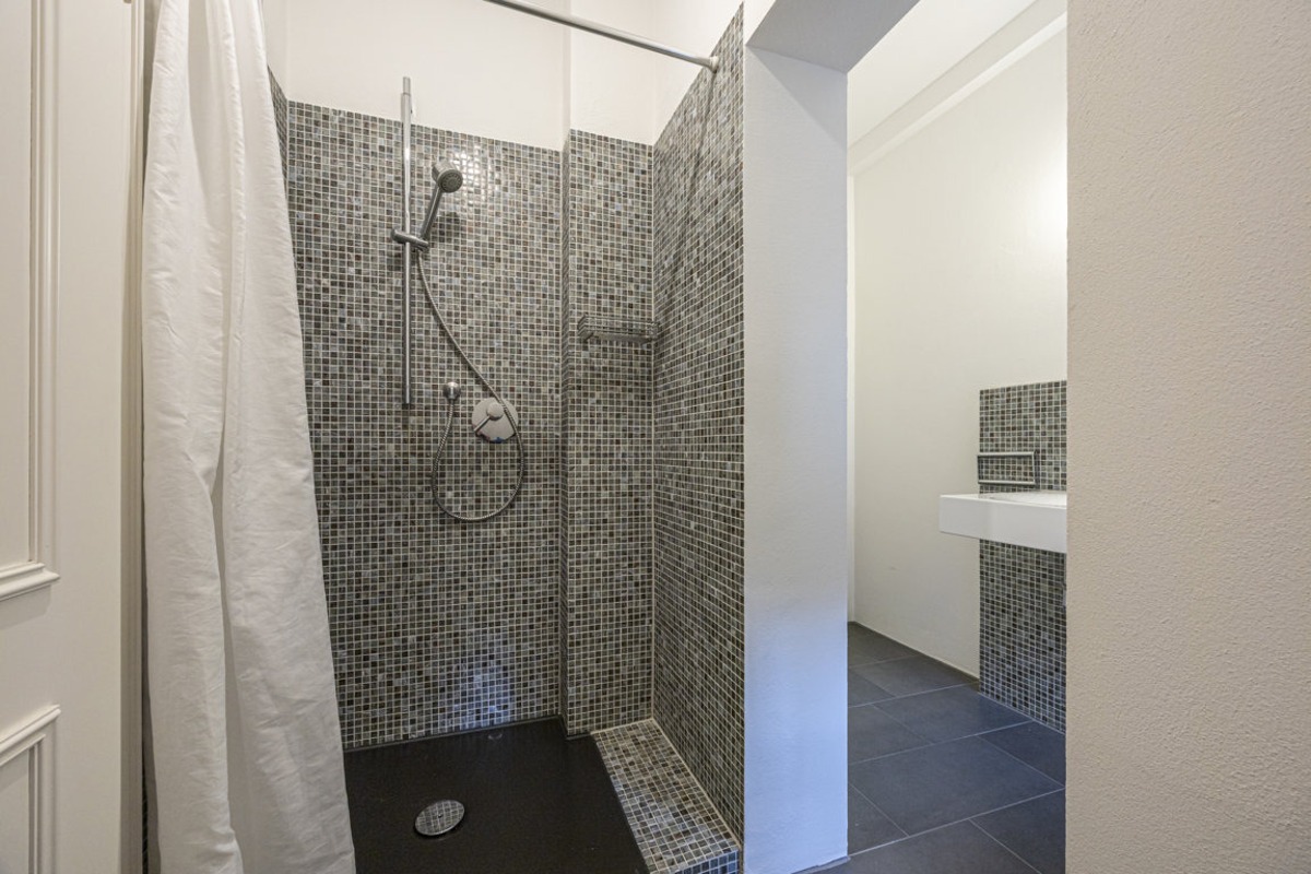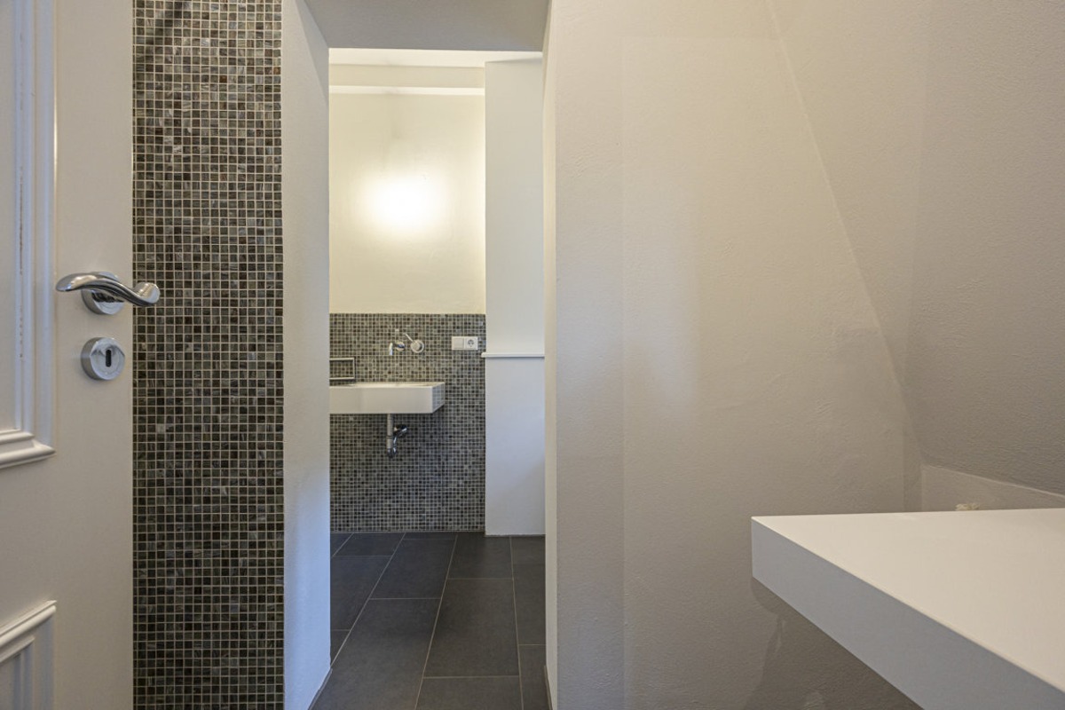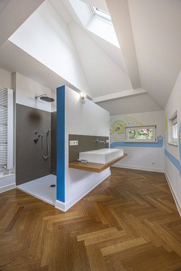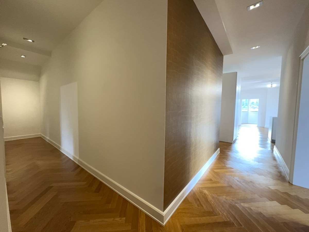 Ferner verfügt die Wohnung über ein Schlaf- oder Gästezimmer, ein Ankleidezimmer oder Büro, ein weiteres Schlaf- oder Kinderzimmer sowie das helle, großzügig verglaste Badezimmer, u.a. mit elektrisch steuerbarem Oberlicht, mit Walkin-Dusche, Badewanne, Doppelwaschbecken, WC, Bidet und Handtuchheizung.