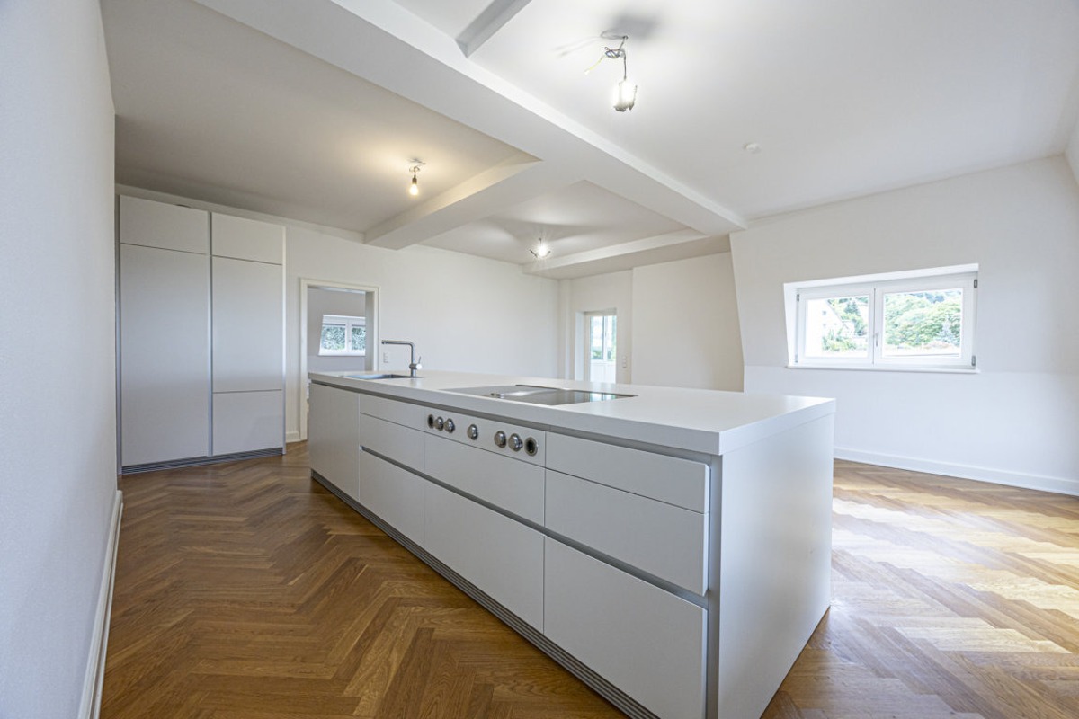 Der Zugang führt in die helle, großzügige, ca. 42 m² große Wohnküche mit hochwertiger Bulthaup-Einbauküche mit Kochinsel. Bereits beim Betreten der Wohnung genießen Sie einen Traumblick über die Dächer von Freiburg bis hin zu den Vogesen.