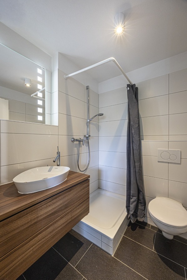 Eine weitere Besonderheit ist, dass die Wohnung optional über einen separaten, ca. 30 m² großen, Einliegerbereich im Hanggeschoss mit eigener Terrasse, Garten und außenliegendem Stau-, Kellerraum verfügt. Der Einliegerbereich verfügt über eine Küche sowie über ein modernes Duschbad. Dieser wurde vom Sohn der Eigentümer bewohnt.