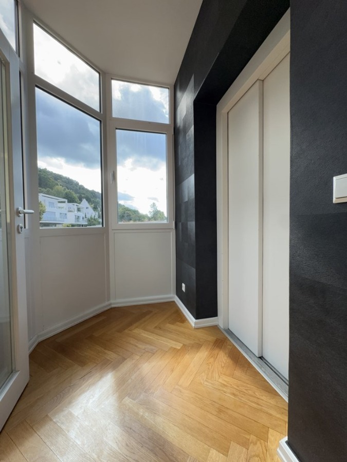 Vom Aufzug gelangen Sie in einen verglasten Vorraum, welcher die Wohnung nochmals über eine Glaswohnungseingangstüre absichert.
