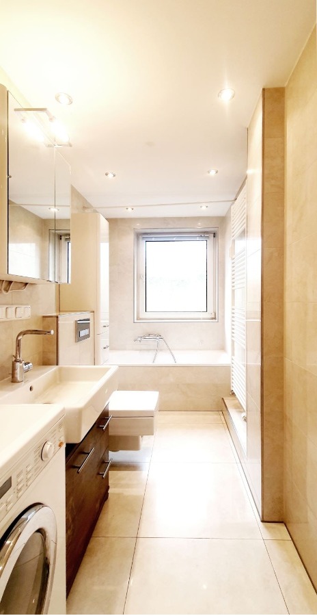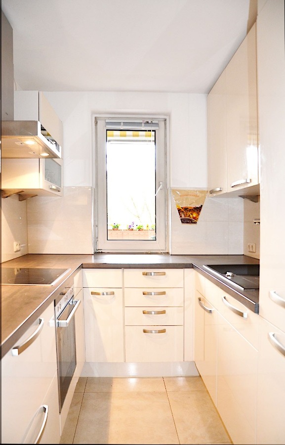 Die Wohnung verfügt über eine Küche mit Einbauküche, ein Bad mit Badewanne, Waschbecken, WC und Fenster, eine Loggia sowie über ein Kellerabteil.
