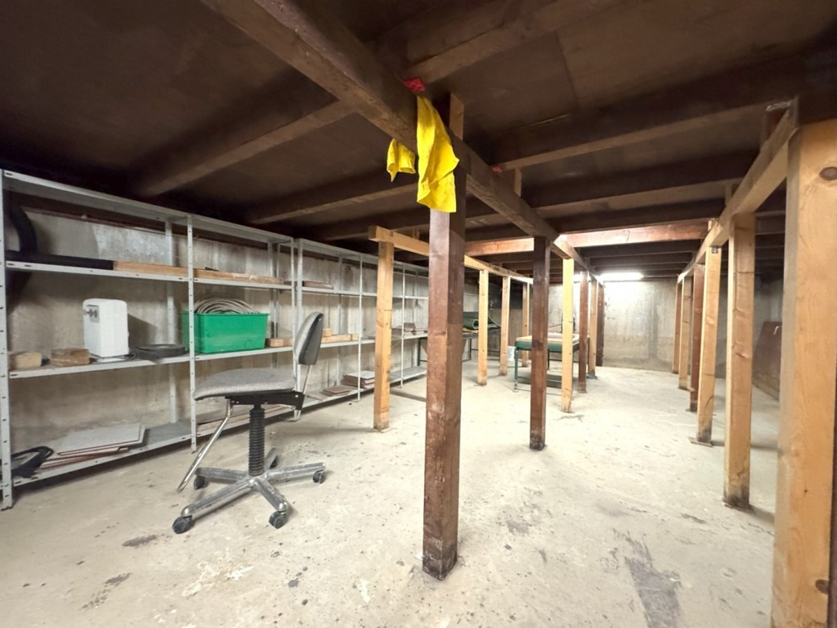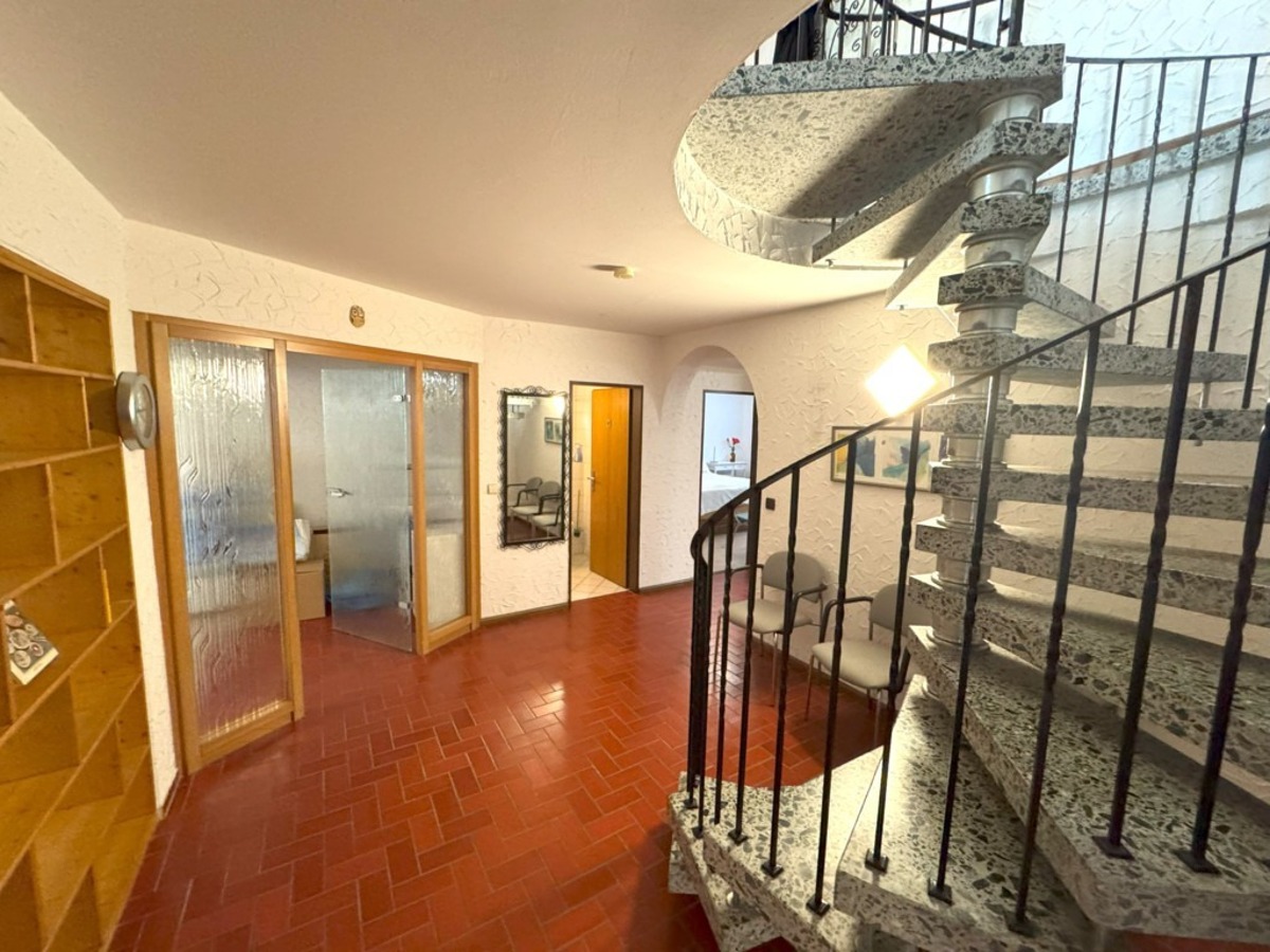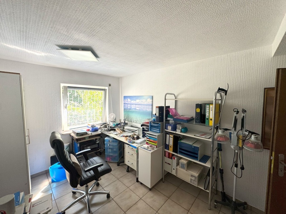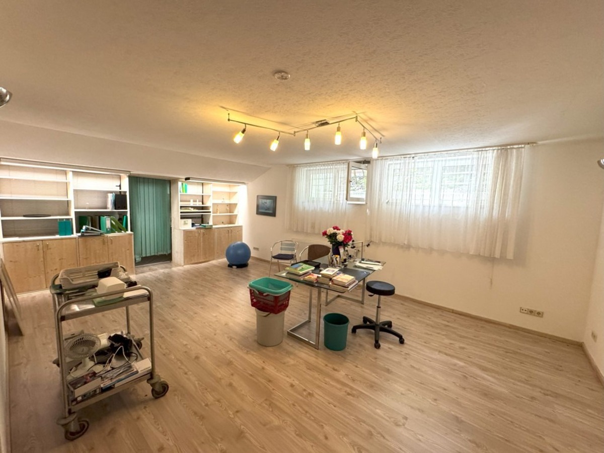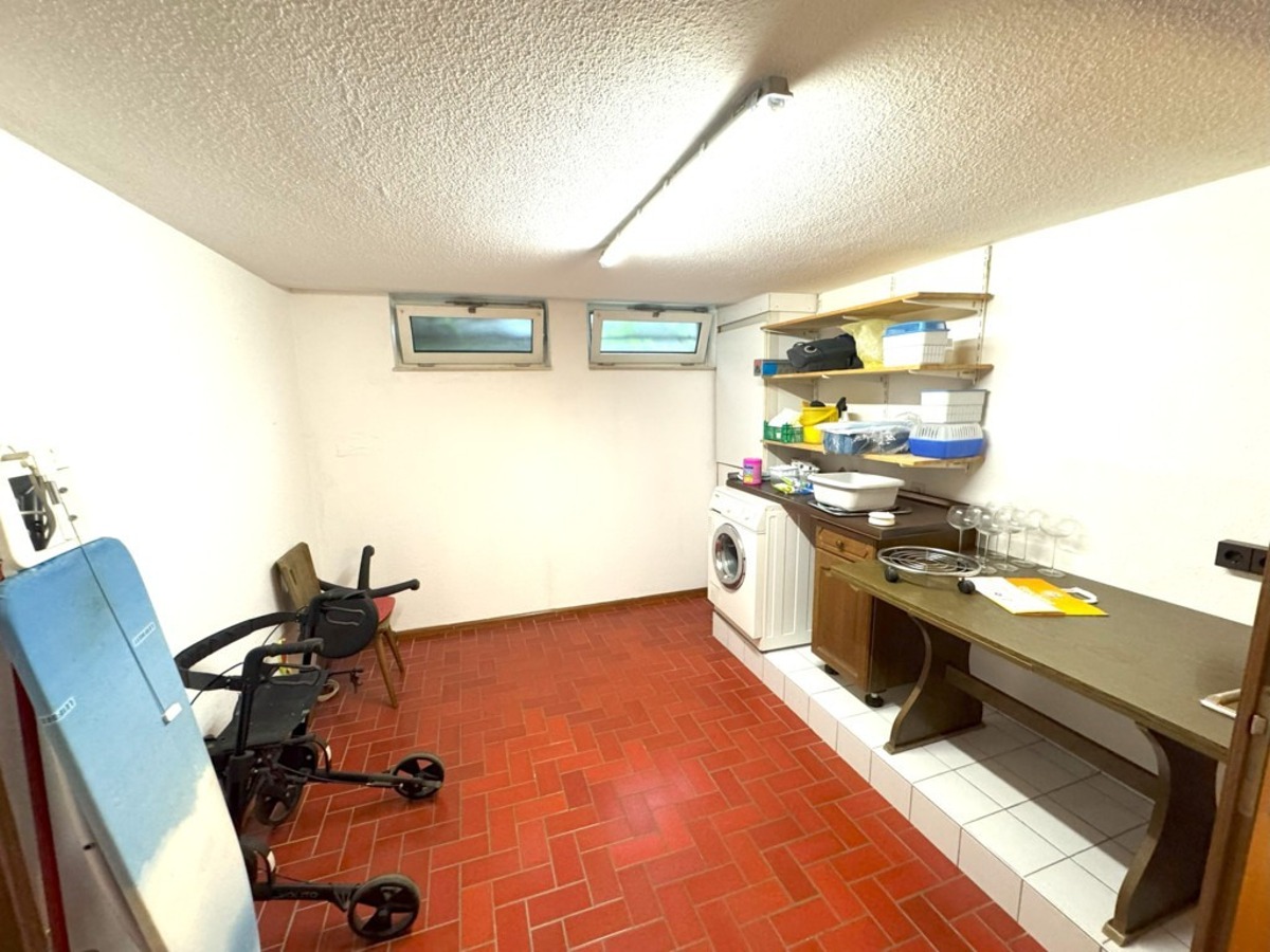 Im hellen Unterschoss / Souterrain verfügt das Haus ebenfalls über eine großzügige Diele, ein weiteres Schlaf-/Gästezimmer, einen großzügigen Hobby- oder Praxisbereich (ehemals Praxis) mit Übergang zu einem weiteren Raum (mit Zugang zum damals geplanten, vorbereiteten Schwimmbad), ein Duschbereich, ein Ankleide bzw. Kleiderschrankbereich mit Vorbereitung einer Sauna, einen Hauswirtschaftsbereich, den Keller/Weinkeller sowie den Heizraum mit erneuerter Gas-Zentralheizung.