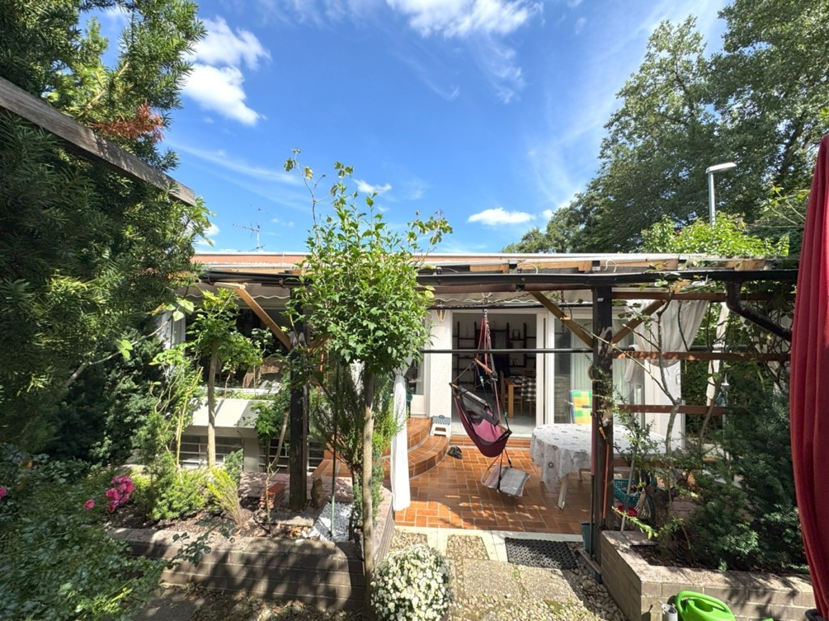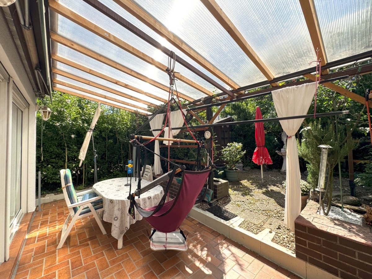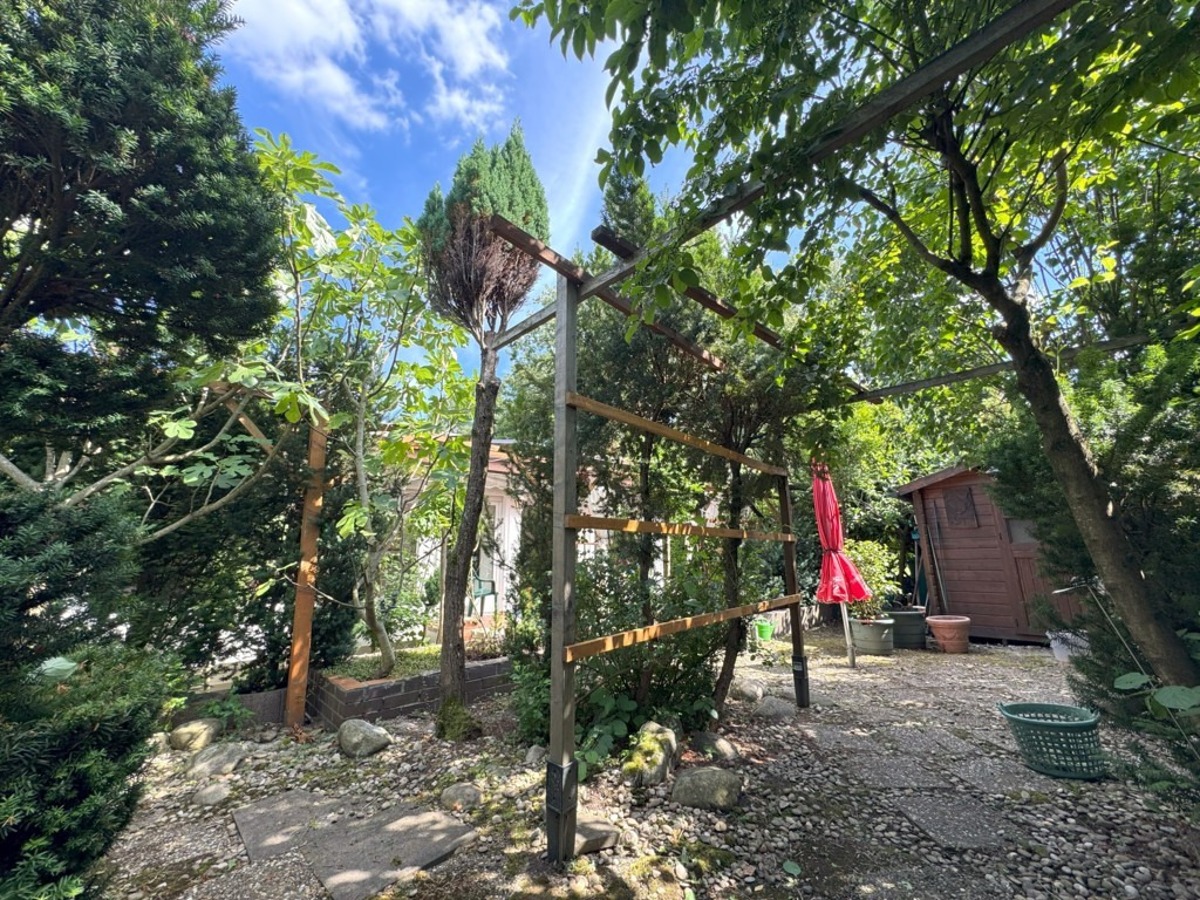 Der Hofbereich ist als Pergola / Carport überdacht. Der Bungalow verfügt über eine großzügige Einzelgarage mit Werkstattbereich.