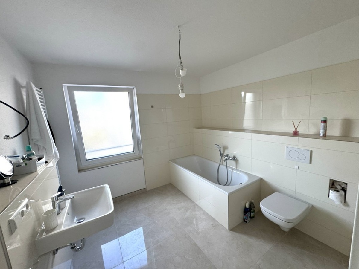 Im Obergeschoss verfügt das Haus über ein Schlafzimmer, zwei Kinderzimmer sowie das moderne Badezimmer mit Badewanne, Dusche, WC und Fenster.