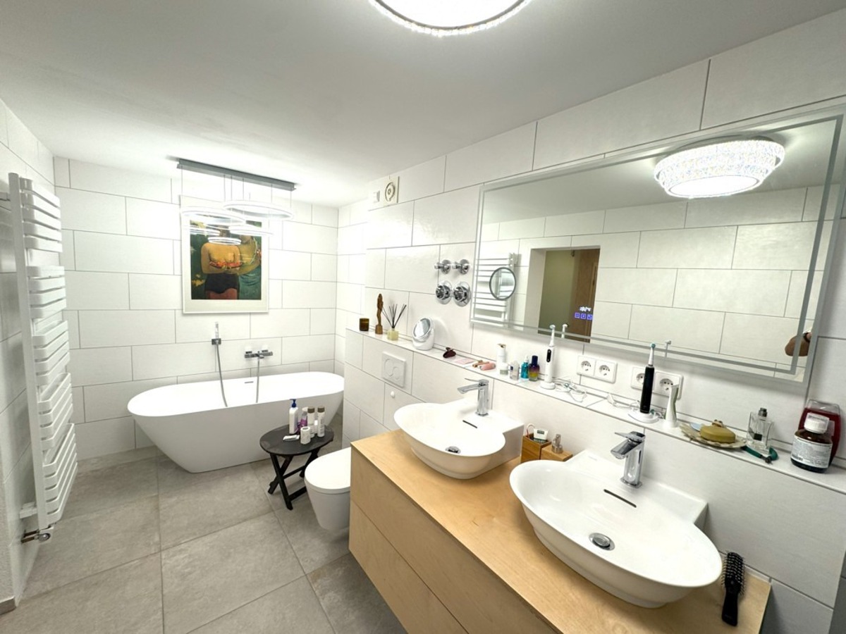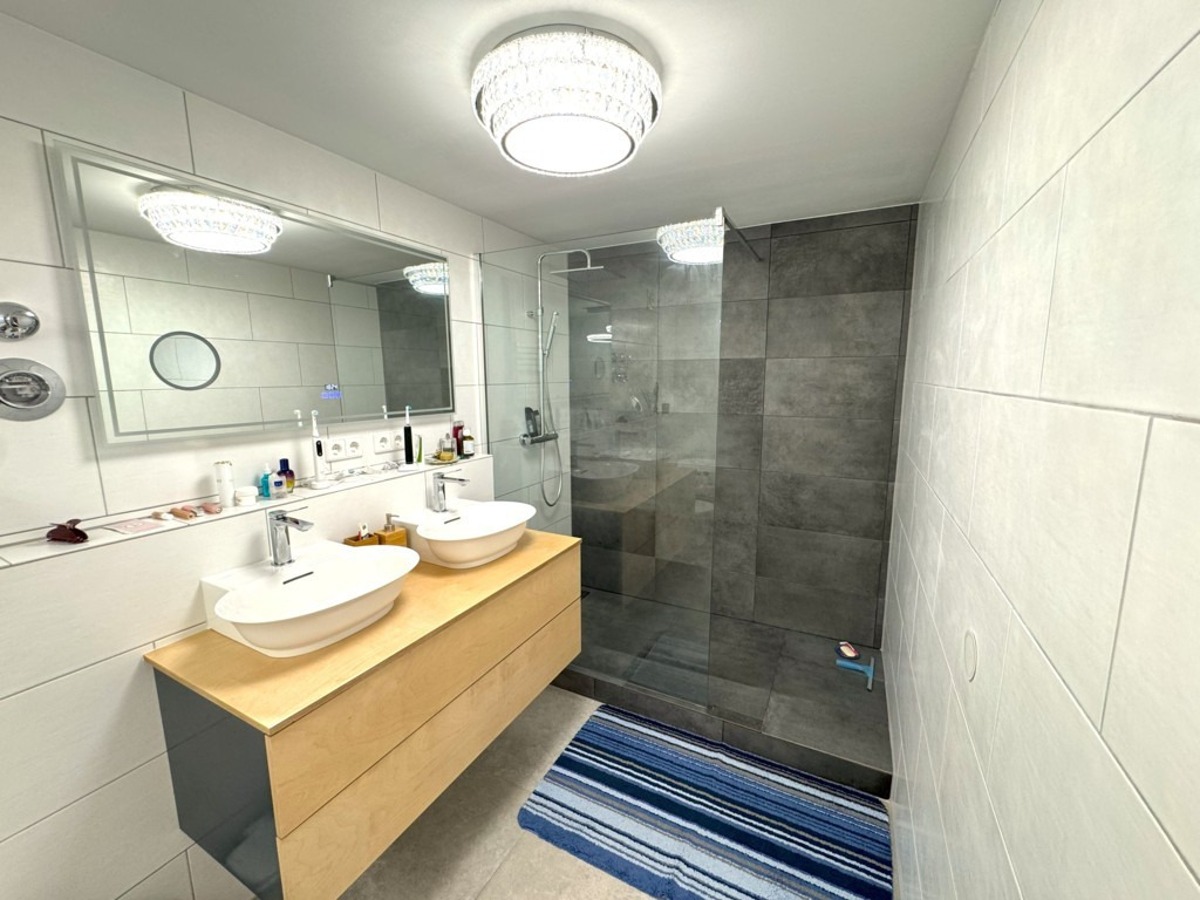 das Wohn- und Esszimmer mit Zugang zur ca. 65 m² großen Panoramaterrasse mit Weitblick, das Schlafzimmer (hier waren vor Umbau 2 Kinderzimmer, könnte jederzeit wieder unterteilt werden), das modern sanierte Badezimmer mit Walkin-Dusche, freistehender Badewanne, WC, Doppelwaschbecken, Handtuchheizung sowie mit vorgelagertem Bereich für Waschmaschine und Trockner, ein großes, weiteres Wohn-, Arbeits- oder Schlafzimmer mit abwinkelten Bereich